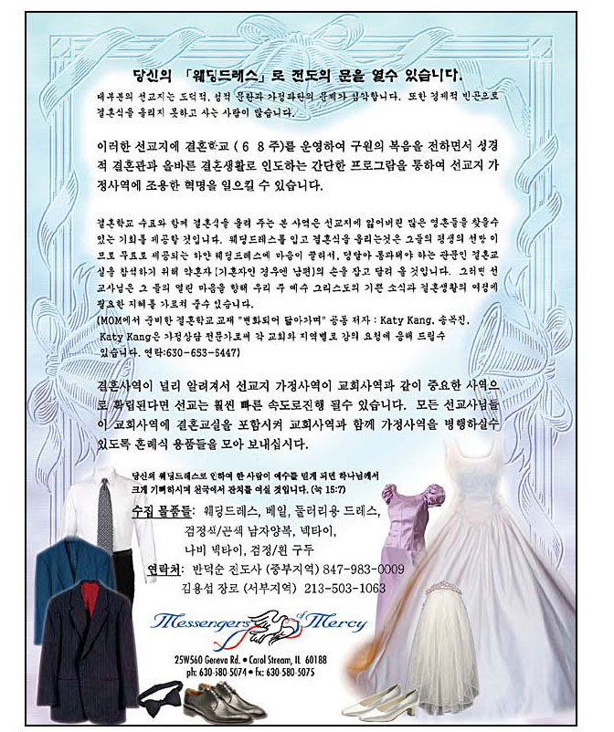 가정사역 (결혼사역/낀세) 복음전도사역에 필요한 물품MOM 의 가정사역에 필요한 물품을 모아 주세요.입던 옷/구두/장식용품 (used one) 이지만 깨끗이 손질한 것으로 모아 주세요.